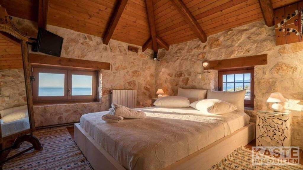 Zur Ausstattung gehören 4 klimatisierte Schlafzimmer mit eigenem Bad, ein gemütliches Wohn-/Esszimmer mit traditionellem Steinkamin, ein geräumiger Balkon mit großem Esstisch und atemberaubendem Meerblick, eine voll ausgestattete Pantry-Küche, ein privater Pool mit Hydromassagebereich, Sonnenliegen, ein traditioneller Holzofen und ein Grillplatz.
