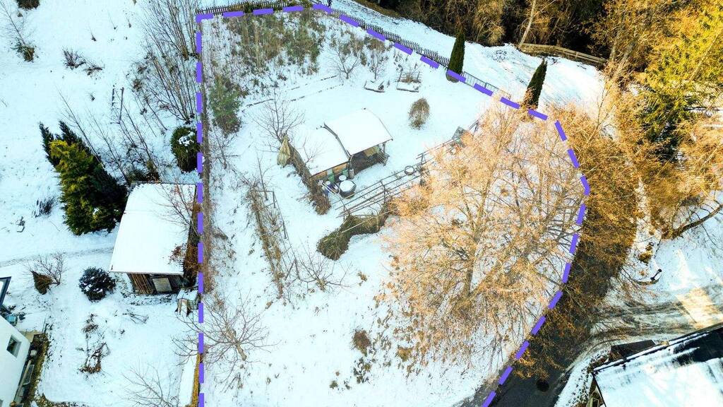 . Grundstücksfläche ca 798 m² . Grundstücksgrenze im Luftbild markiert . Zufahrt über asphaltierte Straße . Bestehendes Gartenhaus auf dem Grundstück . Lage am Waldrand mit direktem Grünbezug . Sichtbezug ins Tal und auf die Bergkulisse . Großzügige Grundstücksform mit gut nutzbarer Freifläche . Rückzugsorientierte Lage mit Abstand zur Bebauung . Naturnahe Umgebung als Erweiterung des Wohnumfelds . Weitläufiger Blickraum für offene Wohnideen . Platz für familiengerechte Außenaufenthaltsbereiche . Zonierbare Bereiche für Spiel und Erholung . Ruhige Grundstückssituation abseits von Durchgangsverkehr . Gute Einbindung in bestehende Nachbarschaftsbebauung . Asphaltierte Zufahrt . Holzzaun . Holzhütte