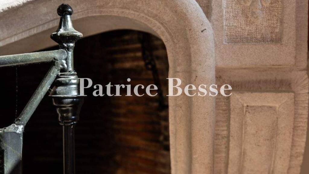 The entrance hall, separated from the kitchen via an atelier window, also provides access to a pantry, a lavatory and a living room-dining room, while the entrance hall and kitchen both feature cabochon tile floors and visible ceiling beams. As for the living room-dining room, with Combe Brune limestone floors, a marble fireplace and wainscoting, it spans the entire ground floor of one of the dwelling's two main buildings and is illuminated by four windows and a set of glass double doors, which all face the garden. In addition, another pair of glass double doors communicates with the back patio and, directly opposite the fireplace, a stone staircase with a wrought-iron guardrail provides upstairs access.