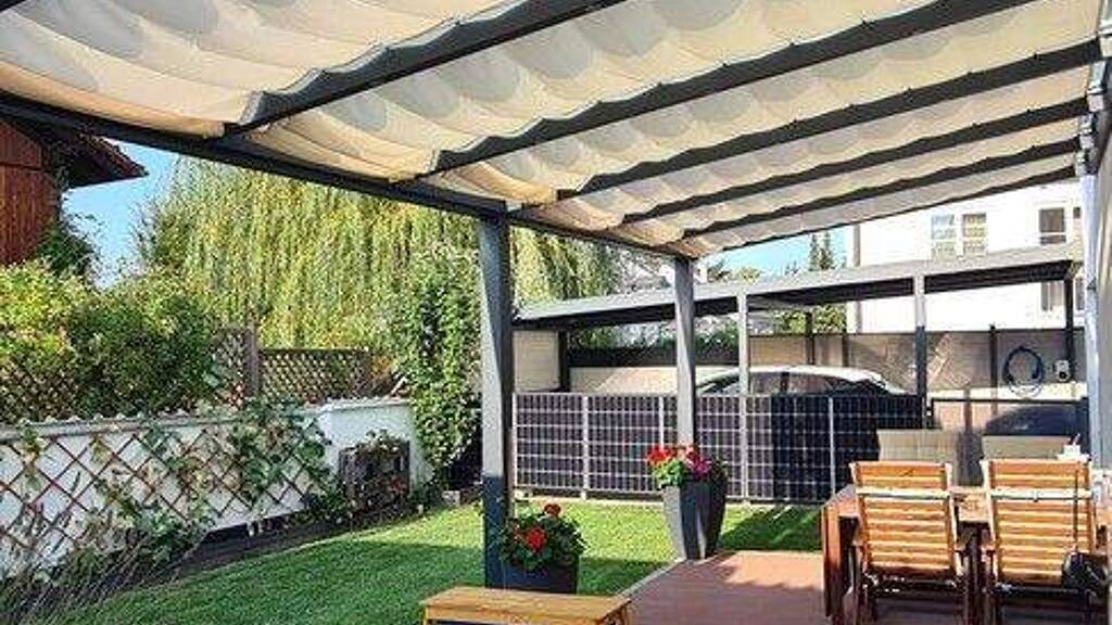 Neben dem Haus ist ein Carport mit Photovoltaik und einer Größe von 7x3,50m. Photovoltaik befindet sich nicht nur auf dem Carport sondern auch auf dem Dach vom Haus genauso wie auf dem Gartenhaus und auf der Lounge.