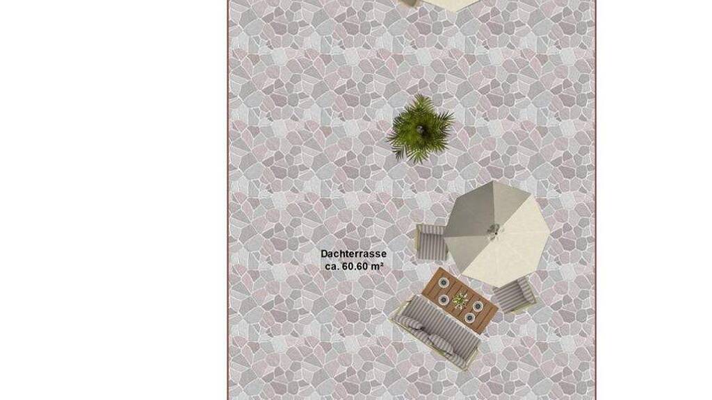Die reine Wohnfläche der Wohnung beträgt ca. 62 qm. Die Dachterrasse wird anteilig mit einer Fläche von 13 qm dazugerechnet. Die gesamte Nutzfläche der Dachterrasse beträgt ca. 60 qm.