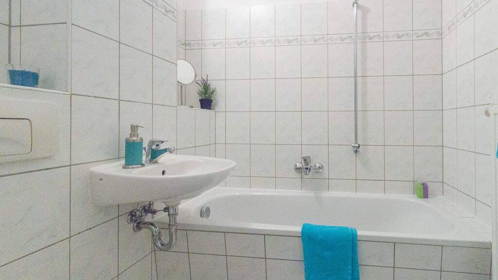 - modern gefliestes, innenliegendes Badezimmer mit Badewanne, WM-Anschluss