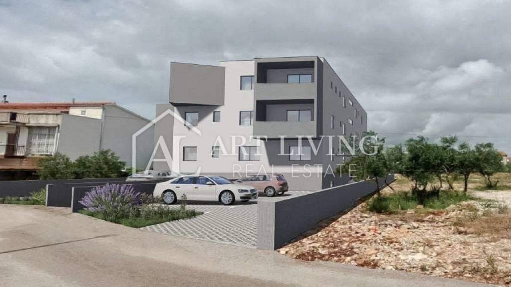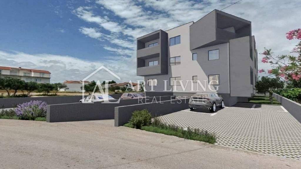 In ausgezeichneter Lage, nur ca. 500 Meter vom Meer und 400 Meter von Geschäften sowie dem Zentrum von Vodice entfernt, hat der Bau eines modernen und hochwertigen Wohngebäudes mit 14 Wohneinheiten begonnen, die sich über drei Etagen erstrecken: Erdgeschoss, 1. Obergeschoss und 2. Obergeschoss. Garagenstellplätze befinden sich im Untergeschoss, während sich vor dem Gebäude offene Parkplätze befinden.