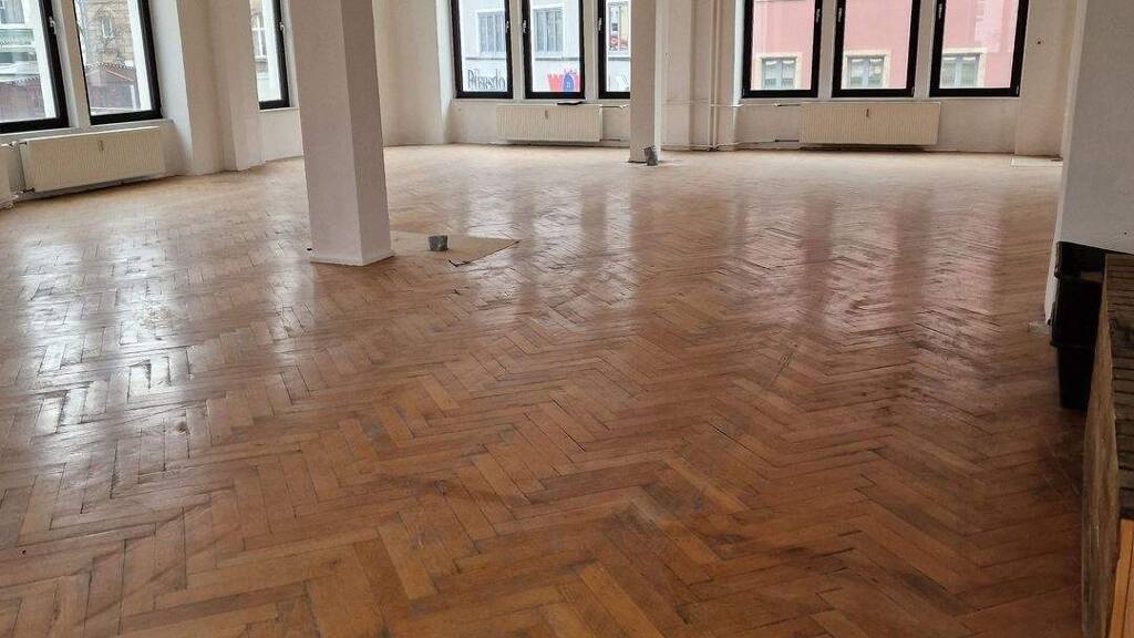 Der Zustand der Böden und Wände ist gebraucht und entspricht dem Zustand nach Auszug des betreibenden Einzelhandelsgeschäfts. Auf den gesamten Flächen ist ein historischer Fischgrätparkett verlegt. Dieser ist teilweise beschädigt, würde jedoch bei einer Anmietung noch vom Vermieter zu dessen Lasten instand gesetzt.