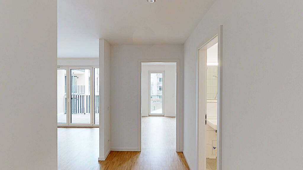 Zum Einen führt er in den großen Wohnbereich mit integrierter Einbauküche und dem Zugang zu einer Loggia. Zum Anderen gehen von hier ein Duschbad, ein Abstellraum mit Waschmaschinenanschluss und das Schlafzimmer ab.