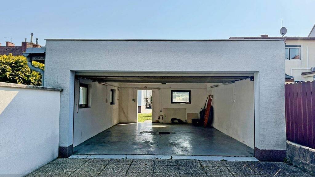 1985 wurde eine Doppelgarage errichtet, die ebenfalls saniert wurde. Da das Grundstück zwischen zwei Gassen liegt, gelangt man von der anderen Seite des Grundstücks in die Garage. Sie verfügt natürlich über einen direkten Ausgang in den Garten und somit zum Haus.