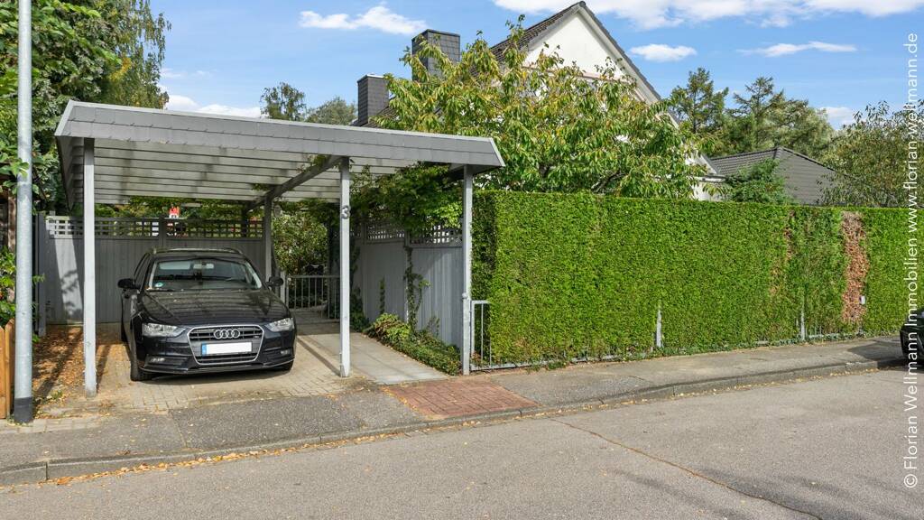 Auch das Verlassen und Ankommen des Anwesens ist durchdacht gelöst: Vor dem Haus steht ein hoher Carport, der samt des Gehweges eine schützende Überdachung bietet. Darüber hinaus befindet sich im hinteren Teil des Gartens eine Garage mit angeschlossenem Geräteschuppen - ein praktischer Mehrwert für alle, die gern Ordnung halten, werkeln oder Gartenstühle sauber verstauen möchten. Besonders komfortabel ist die eigene zweite Zufahrt über eine Nebenstraße, die diesen Bereich unabhängig erschließt und zusätzliche Flexibilität im Alltag schafft.