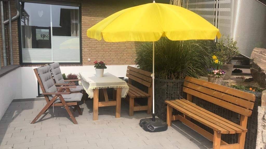 In das etwas mehr als 50 qm große, im Souterrain eines Zweifamilienhauses gelegene, und erst 2021 fertig gestellte Appartement gelangt man durch einen separaten Eingangsbereich mit Garderobe weiter in den Wohn-/Essbereich ausgestattet mit gemütlicher großer Eckcouch (Auszieh-/Schlaffunktion), Couchtisch, Esstisch für bis zu vier Personen und Sat/Smart-TV.