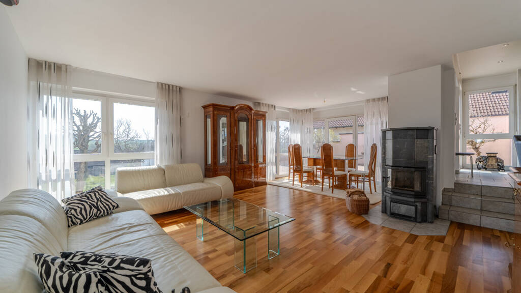 Mit rund 133 m² Wohnfläche sowie zusätzlichen ca. 101 m² Nutzfläche bietet das Haus insgesamt 6,5 Zimmer und damit viel Raum für individuelle Lebenskonzepte. Drei gut geschnittene Schlafzimmer schaffen angenehme Rückzugsorte, während weitere Räume flexibel als Homeoffice, Gästezimmer oder Hobbybereich genutzt werden können. Das geräumige Badezimmer fügt sich harmonisch in das familienfreundliche Raumkonzept ein. Der helle Wohnbereich mit hochwertigem Parkett und zusätzlichem Kachelofen bildet das Herzstück des Hauses und vermittelt eine warme, einladende Atmosphäre. Große Fenster sorgen für viel Tageslicht und einen schönen Bezug zum Garten. In den übrigen Räumen unterstreichen pflegeleichte Fliesen die Alltagstauglichkeit. Die gepflegte Einbauküche fügt sich funktional in das Gesamtbild ein und bietet direkten Zugang zur großzügigen Terrasse - ein wunderbarer Ort für entspannte Stunden im Freien mit Blick ins eigene Grün. Die Heizungsanlage stammt aus dem Baujahr. Der voll unterkellerte Bereich eröffnet wertvolle Nutzfläche für Hobby, Fitness oder zusätzlichen Stauraum. Ergänzt wird das Angebot durch eine großzügige Garage mit zusätzlichem Stauraum im darüberliegenden Bereich. Direkt angrenzend befindet sich zudem ein überdachter Stellplatz (Carport), der einem weiteren Fahrzeug einen geschützten Platz bietet. Ergänzt wird dies durch davorliegende Stellmöglichkeiten für weitere Fahrzeuge.