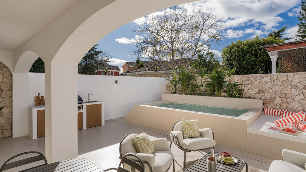 Occupying a privileged corner position within the community, the home benefits from increased privacy and excellent natural light. Recently completely renovated, it features a contemporary open-plan design finished with high-quality materials and carefully selected furnishings, creating a balanced and inviting modern home. Comfort is assured year-round with hot and cold air conditioning and underfloor heating throughout. Arranged across two levels, the ground floor offers a spacious open-plan living area with a sleek modern kitchen, fully equipped with top-of-the-range appliances and a central island. The bright living space opens directly onto a partially covered terrace featuring an outdoor kitchen with integrated grill and wine fridge. This alfresco dining area is complemented by a private heated swimming pool and outdoor shower, ideal for year-round enjoyment. This level also includes a guest bedroom, a bathroom, and a dedicated laundry area.