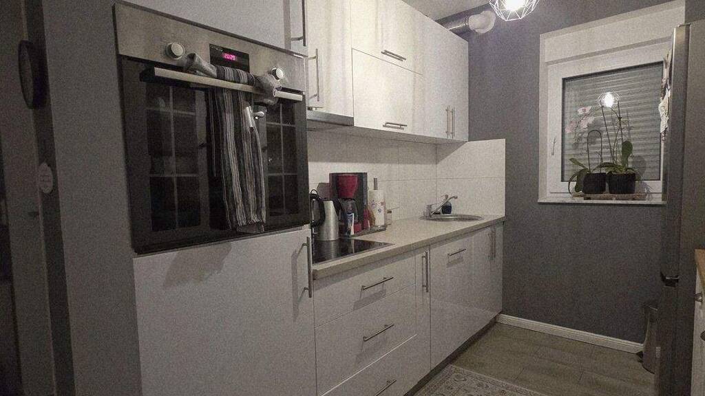 Der Mittelpunkt der Wohnung ist das helle Wohnzimmer, das über eine offene Küche mit einer modernen Einbauküche mit E-Geräten verfügt. Vom Wohn- und Essbereich gelangen Sie auf die Terrasse.