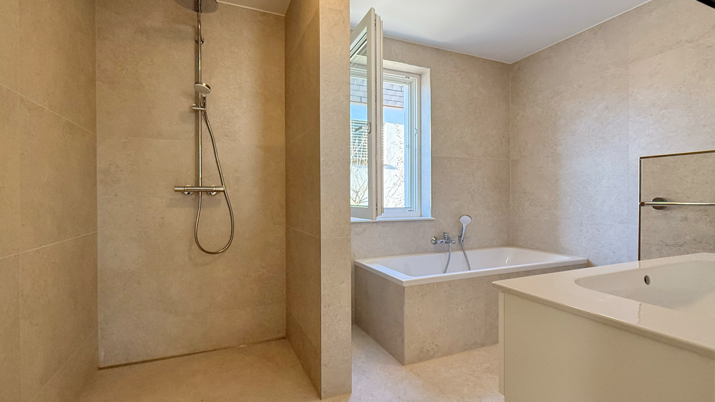 - Edle Parkett- und Dielenböden, großformatige Fliesen in den Sanitärbereichen
