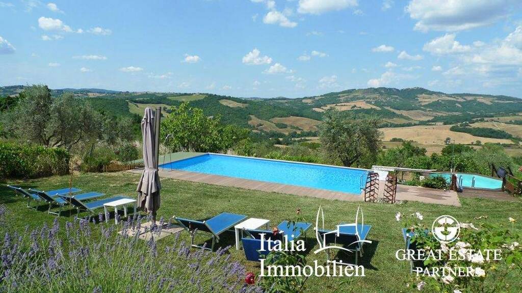 Charmanter landwirtschaftlicher Betrieb nur wenige Kilometer von Radicondoli entfernt, in panoramischer Lage mit Blick auf die toskanische Landschaft, bestehend aus einem Haupthaus von ca. 180 m² und einer Dependance von ca. 160 m² sowie einem Anbau als Weinkeller. Das Anwesen ist von 7 Hektar Land mit Olivenhain und Weinberg umgeben und verfügt über einen Garten mit Panoramapool und Kinderpool. In ausgezeichnetem Zustand mit typischen toskanischen Ausstattungen, voll erschlossen, ideal sowohl als privates Wohnhaus als auch als Ferienresidenz oder Beherbergungsbetrieb.