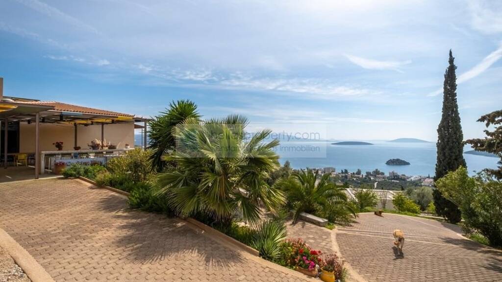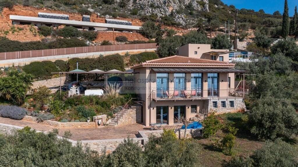 Die 2016 erbaute Villa im edlen Landhausstyl ist ein beeindruckendes Wohnhaus in idyllischer Lage oberhalb der Küstenstadt Tolo.