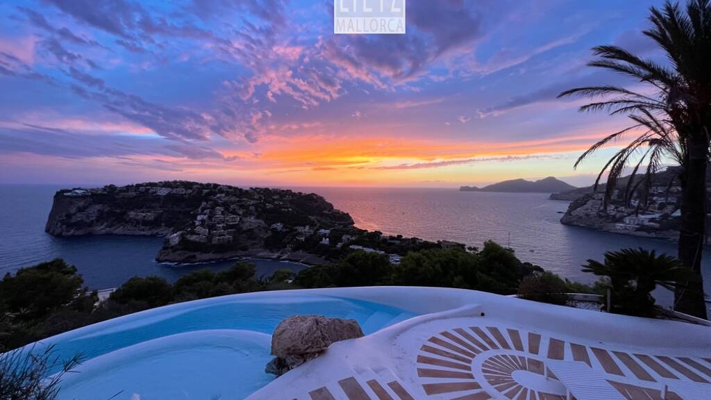 Spektakuläre Bestlage mit Blick auf La Mola, das offene Meer, Dragonera und die gesamte Hafeneinfahrt! Genießen Sie unzählige und fantastische Sonnenuntergänge durch die perfekte Süd-West-Ausrichtung das ganze Jahr. Die 1999 durch den berühmten Architekten Alberto Rubio auf einem knapp 1.500 qm großen Grundstück fertiggestellte Villa im klassischen Möwen-Design verzaubert durch die besondere Architektur, extrahohe Decken, verschiedene Ebenen und runden Formen sowie diesem einmaligen Blick aus jedem der Wohnbereiche und den 3 Hauptschlafzimmern mit jeweils Bad en-suite. Großzügige Ausbaureserven bieten weiteren Platz. Herrlich sind auch die Außenbereiche mit verschiedenen offenen und überdachten Terrassen, einem BBQ-Bereich und ein kleiner flacher Garten. Ein großer Kellerraum kann wahlweise zur Sauna, Gym oder Kino umgebaut werden. Alle Zimmer sind durch Fußbodenheizung und Klimaanlagen kalt/warm ganzjährig wohl temperiert und mit kleiner Modernisierung kann hier ein wahrhaftiger Traum entstehen. Einfach beeindruckend!