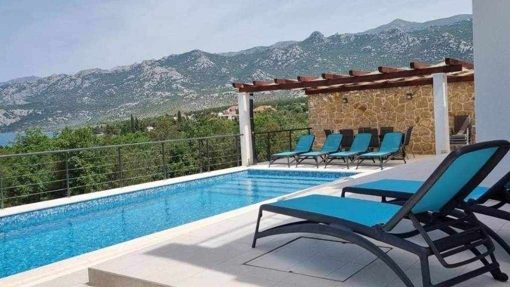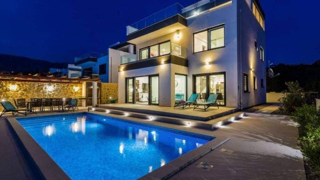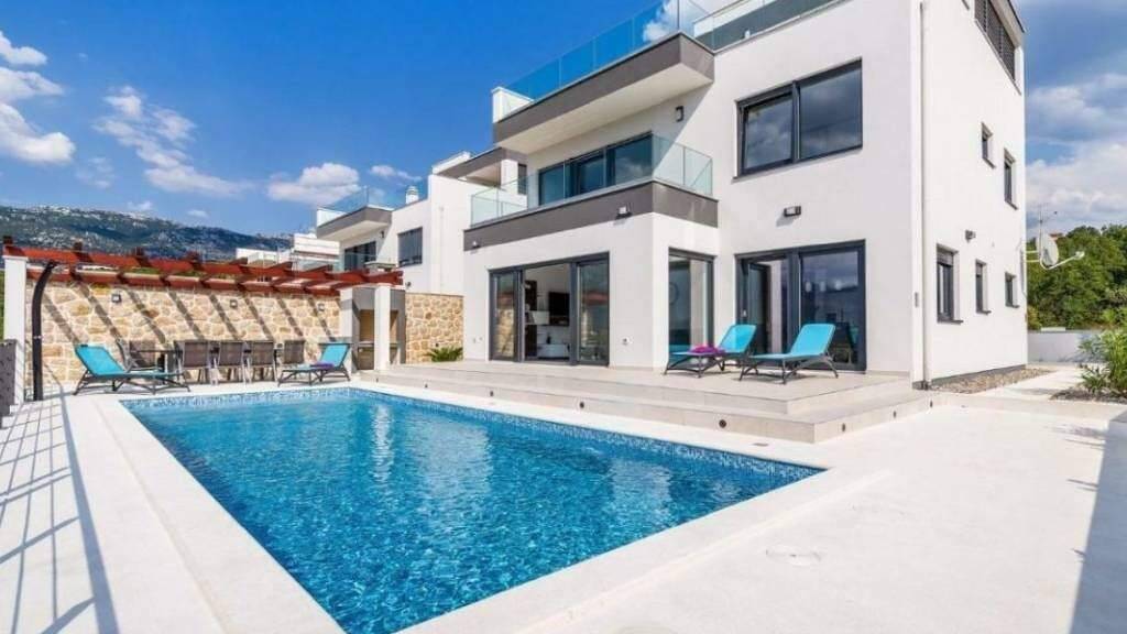 In unmittelbarer Nähe von Zadar steht eine elegante Villa mit Pool und freiem Meerblick zum Verkauf. Auf einem 700 m großen Grundstück gelegen, bietet sie eine Wohnfläche von 270 m, verteilt auf drei Etagen. Dank der Hanglage und des großen Vorgartens ist eine Bebauung vor dem Haus nicht möglich, wodurch ein unverbaubarer Meerblick dauerhaft gewährleistet ist.