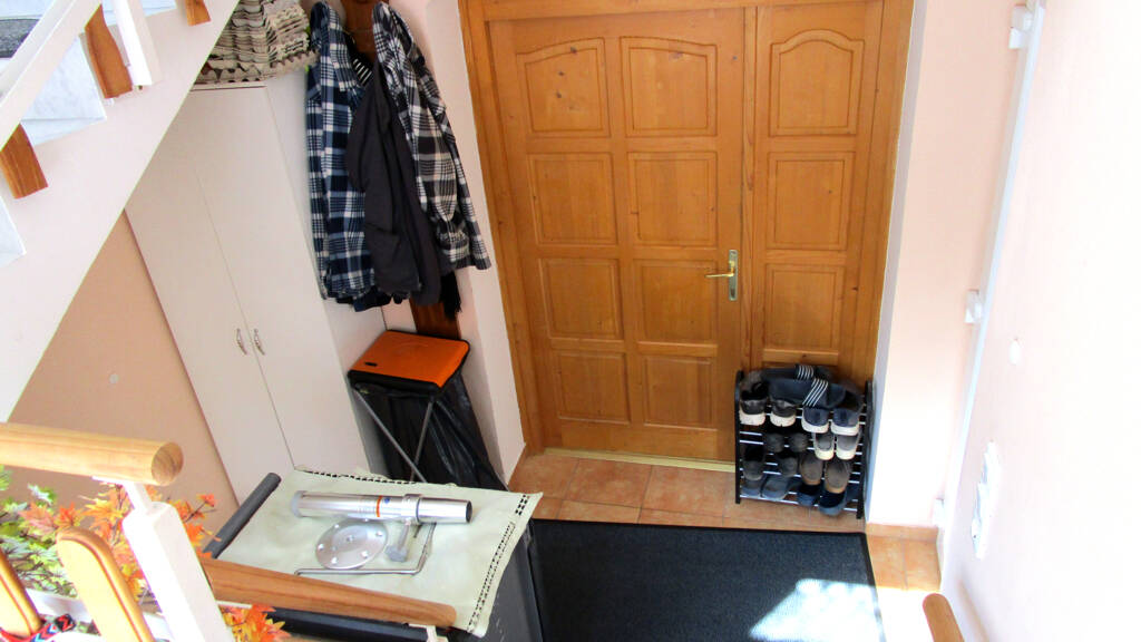 Das Obergeschoss hat eine Grundfläche von 65 m2 und wird derzeit als Ferienunterkunft genutzt. Die dazu gehörige Balkonfläche beträgt 18 m2. Die Wohnung hat ein Schlafzimmer, ein Kinderzimmer mit zwei Betten, ein Bad mit Dusche, ein Wohnzimmer und eine große Küche. Von der Küche und dem Wohnzimmer aus kann man auf den großen, teilweise überdachten Balkon gehen. Er kann mit einer elektrischen Fußbodenheizung oder einem Kamin beheizt werden.