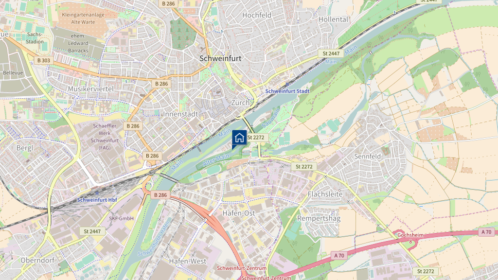 Nicht nur das Stadtzentrum ist lediglich einen Katzensprung entfernt, auch die Einkaufsmöglichkeiten im Schweinfurter Hafen liegen in unmittelbarer Nähe. Die Anbindung an das Stadtbusnetz ermöglicht Mobilität auch ohne eigenen PKW.