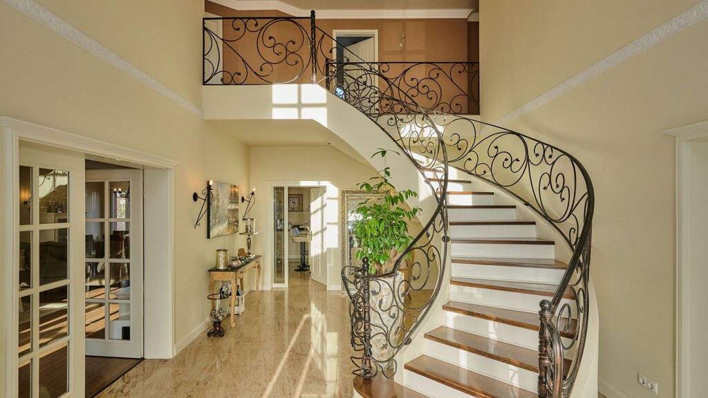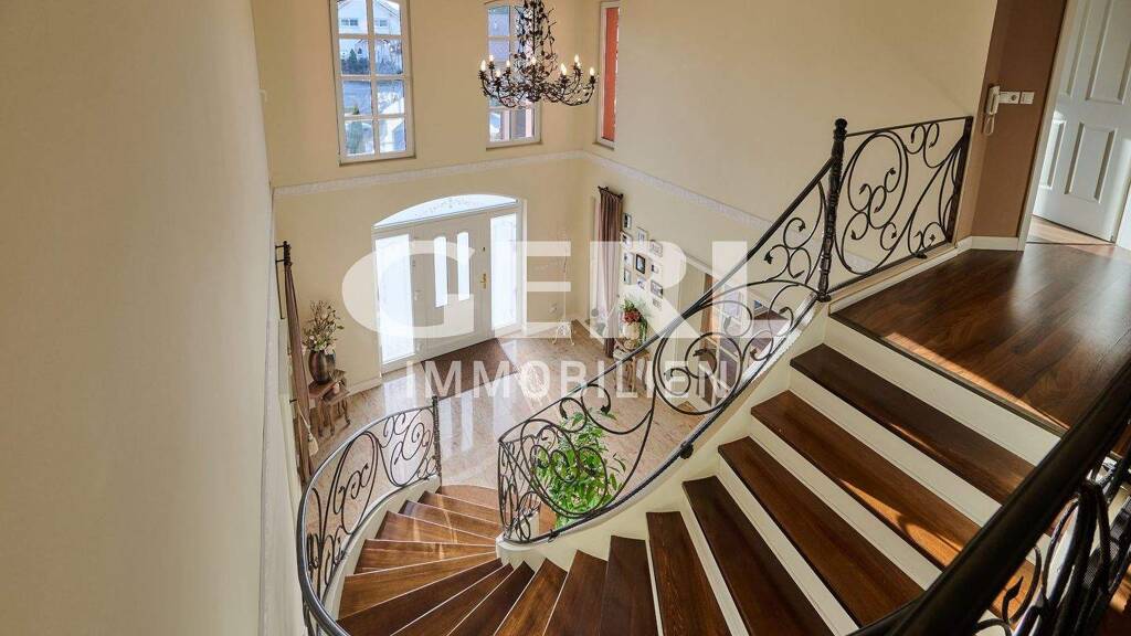 Die Villa unterteilt sich in ein Hauptwohnhaus und einer Einliegerwohnung mit separatem Zugang. Besucher werden mit einer großzügigen Einfahrt und einer imposanten Außenfassade mit massiven Säulen begrüßt. Im Eingangsbereich des Haupthauses wird man von einer großzügigen Eingangshalle begrüßt und eine Wendeltreppe führt in den ersten Stock zur Galerie und zu den Schlafzimmern. Ein weiteres Highlight ist das Arbeitszimmer im Erker, das durch die bodentiefen Fenster lichtdurchflutet wird. Die großzügige Küche bietet viel Platz zum Kochen und Komfort. Auf der schönen Terrasse kann man im Freien entspannen. Mit insgesamt 3 Etagen des Gebäudes erstreckt sich die Wohnfläche auf verschiedene Ebenen und ermöglicht ein komfortables Wohngefühl für die Bewohner. Der separate Gebäudeteil beinhaltet die großzügige und unterkellerte Einliegerwohnung mit separater Terrasse, die sich durch die Süd-Ost Ausrichtung ideal zum Frühstücken eignet.
