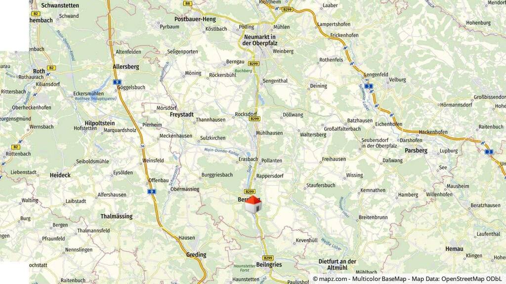 Die Liegenschaft liegt im SĂĽden der Stadt Berching - in einem Gewerbegebiet direkt in Sichtweite der BundesstraĂźe B299, welche sich nur 750 m entfernt befindet.