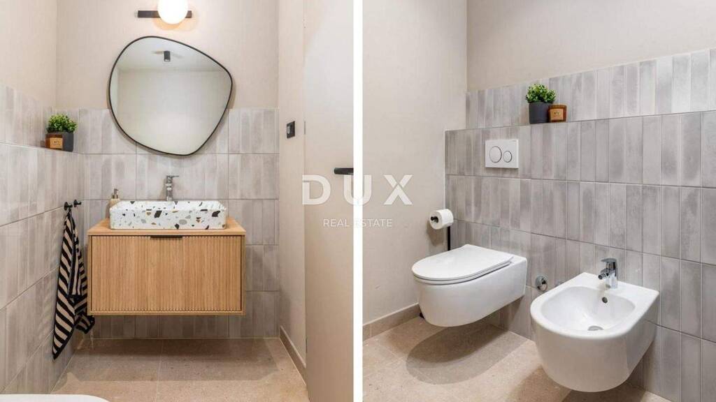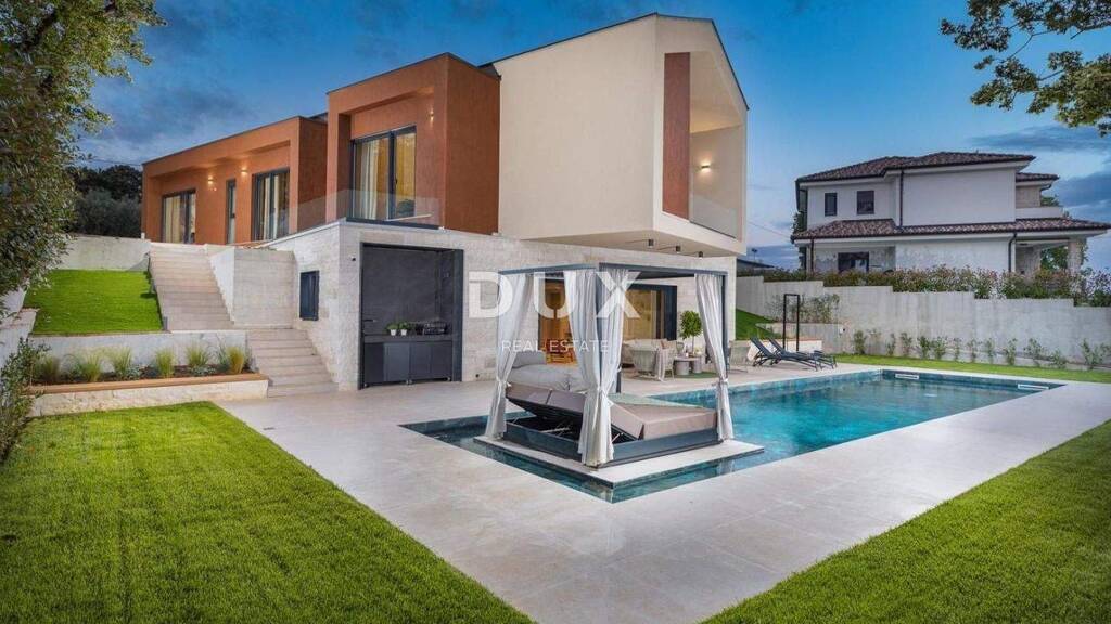 Eingebettet in ein angenehmes mediterranes Klima, im Herzen der Westküste Istriens gelegen, erstreckt sich die antike Stadt Porec mit ihrer unberührten Naturschönheit, ihren Landschaftsparks, Pinien- und Eichenhainen, die bis ans Meer reichen und an denen sich klares Meer, Strände, Buchten und Inseln abwechseln, über eine Fläche von 139 km² und besteht aus 58 Siedlungen. Mit der Identität einer urbanen Küstenstadt ist Porec eine Stadt der Kultur, des Sports, der Unterhaltung, des Tourismus und der wahren Gastfreundschaft. Eine der attraktivsten Städte des kroatischen Tourismus, die auf einzigartige Weise die natürliche Schönheit Istriens, ein reiches kulturelles und historisches Erbe und die modernsten Annehmlichkeiten eines Top-Reiseziels verbindet. Die Harmonie des Altstadtkerns, der ein Kulturdenkmal ist, mit einem der berühmtesten istrischen Kulturdenkmäler, der Euphrasius-Basilika, die zum UNESCO-Weltkulturerbe gehört, und den am besten erhaltenen und ausgestatteten Touristensiedlungen an der Adria bildet ein Mosaik unvergesslicher Erlebnisse. Porec ist auch eine Stadt, die viel mehr ist als ein Sommerziel mit Sonne und Meer. Porec ist eine Stadt, die auf die Bedürfnisse eines Menschen zugeschnitten ist. Eine Stadt, in der es einen ständigen Impuls gibt, die Lebensbedingungen zu verbessern und den Fortschritt in verschiedenen Bereichen voranzutreiben. Eine Stadt, die ein angenehmer, sicherer und gepflegter Wohnort ist, in dem jeder seinen Platz findet, eine Stadt ohne Zuschläge mit hoher sozialer Sensibilität für alle Generationen. In einer kleinen, charmanten Stadt in der Nähe von Porec steht ein Designerhaus mit Swimmingpool zum Verkauf. Die Immobilie repräsentiert eine Harmonie aus Raum, Bedürfnissen, Funktionen, Bauweise und Schönheit. Die Lage bietet ein authentisches Erlebnis einer kleinen istrischen Stadt, Intimität und eine Pause vom Lärm und liegt zudem in der Nähe dynamischer istrischer Städte mit einer Reihe von Einrichtungen. Neben der Lage, die umfassenden Komfort bietet, zeichnet sich die Immobilie auch durch die Bauqualität aus, die langfristige Zufriedenheit und Lebensqualität garantiert. Sie zeichnet sich durch moderne Architektur mit Dynamik in der Außen- und Innengestaltung aus. Die Kombination aus klaren Linien, Stein und Glas verleiht dem Haus einen besonderen visuellen Charakter und ein sehr modernes Design. Im Einklang mit der puristisch-modernistischen Architektur besticht das lichtdurchflutete Innere des Hauses durch seinen minimalistischen Stil, die hochwertige Ausstattung und moderne, maßgefertigte Möbelelemente. Das Haus ist als Wohneinheit auf zwei Etagen konzipiert. Der Haupteingang befindet sich im Obergeschoss. Dort befinden sich vier Schlafzimmer, drei Bäder, ein Wohnzimmer mit Zugang zu einer Loggia mit Sauna und Whirlpool sowie eine Eingangshalle mit Treppenaufgang. Auf gleicher Höhe mit dem Obergeschoss bietet eine sorgfältig gestaltete Auffahrt Parkplätze sowie über eine Außentreppe Zugang zum Untergeschoss und zum Innenhof. Das Untergeschoss besteht aus einem offenen Raumkonzept, das Wohnzimmer, Esszimmer und Küche vereint und sich durch Glasschiebewände zu einer überdachten Terrasse mit Blick auf den Außenbereich und einen beheizten Pool mit Liegewiese öffnet. Abgerundet wird der Grundriss durch ein Gäste-WC, einen Abstellraum und einen Technikraum. Der Garten ist stimmungsvoll und gärtnerisch gestaltet und eingezäunt. Die Lage, die Struktur und der Komfort machen diese Immobilie zu einer idealen Gelegenheit für ein ruhiges Familienleben sowie als Investition zur touristischen Vermietung. Der Verkäufer der Immobilie ist eine juristische Person und der angegebene Preis versteht sich inklusive Mehrwertsteuer.