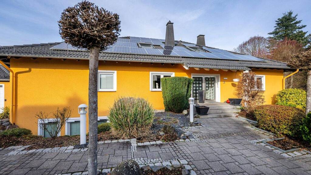Das parkähnlich angelegte Grundstück bildet den passenden Rahmen für die Architektur. Die weitläufige, teils überdachte Terrasse bietet einen angenehmen Fernblick und führt direkt zum Außenpool mit Gegenschwimmanlage. Für den Fuhrpark stehen eine Doppelgarage sowie ein großzügiger Carport und Außenstellplätze zur Verfügung.