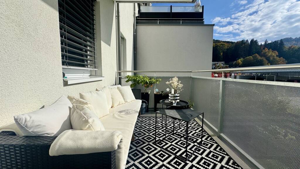Vom Wohnraum aus führt der Weg auf den sonnigen Balkon, der mit seiner ruhigen Atmosphäre zum Entspannen einlädt.