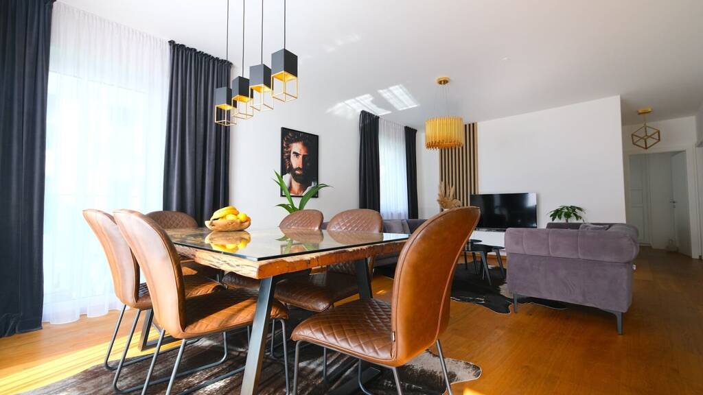 Das Herzstück ist der großzügige Wohn- und Essbereich mit seiner hochwertigen Küche und der stilvollen Lichtgestaltung.