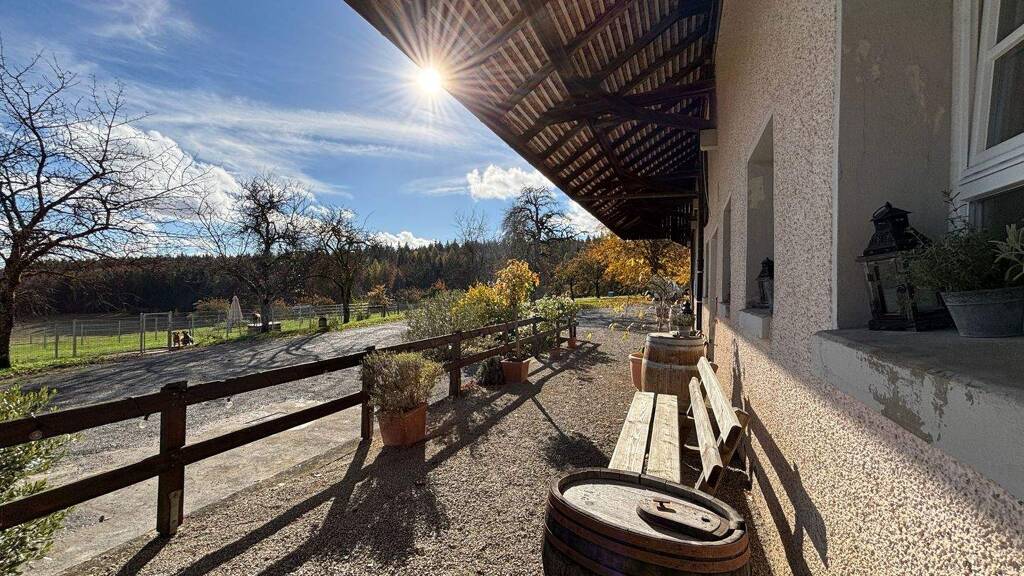 Das Hofgut Dornsberg liegt in ruhiger, exponierter Lage auf dem Höhenzug "Dornsberg" bei Eigeltingen im Hegau. Von hier eröffnet sich ein eindrucksvoller Panoramablick über die sanft geschwungene Landschaft bis hin zum Bodensee. Das barocke Anwesen wurde um das Jahr 1750 ursprünglich von den Mönchen des berühmten Kloster Salem erbaut, die gleichen Bauherren des Barockjuwels Birnau. Heute präsentiert sich das Hofgut als außergewöhnliches Ensemble aus Geschichte, Natur und landschaftlicher Schönheit - ein Ort mit Charakter, Ruhe und großem Potenzial. Die Lage bietet absolute Privatsphäre und zugleich eine gute Erreichbarkeit. Durch die erhöhte Position auf dem Dornsberg genießt man einen unverbaubaren Weitblick in alle Himmelsrichtungen. Das historische Haupthaus zeigt sich als klassisches Herrenhaus mit liebevoll erhaltenen, stilprägenden Details. Hohe Räume, große Fenster und massive Natursteinmauern verleihen dem Gebäude einen unverwechselbaren Charme. Die Innenräume wurden modernisiert, ohne den historischen Charakter zu verlieren. Im Eingangsbereich verströmen schöne Holztüren, Steinfliesen und die Holztreppe zum Obergeschoss edlen Landhausflair. Im Erdgeschoss befinden sich das Wohnzimmer mit offenem Kamin, die große Wohnküche mit angegliedertem Speisezimmer sowie Gäste-WC und Garderobe. Das Obergeschoss beherbergt zwei weitere Zimmer, das Familienbad sowie das Gästezimmer mit eigenem Bad. Der teilausgebaute Dachboden und die Kellerräume bieten viel Stauraum. Die Gesamtanlage umfasst zudem diverse Nebengebäude, wie eine Scheune, ein ehemaliges Backhaus, eine alte Umspannstation und einen Schuppen. Sie eignen sich ideal für Tierhaltung, Werkstätten, Gästeunterkünfte oder Veranstaltungen. In der Scheune wurden für Pferdehalter zwei Pferdeboxen errichtet und Raum für weitere Boxen ist vorhanden. Für die landwirtschaftliche Nutzung kann weiteres Weideland dazu gepachtet werden. Das Hofgut Dornsberg bietet ein außergewöhnlich breites Nutzungsspektrum: