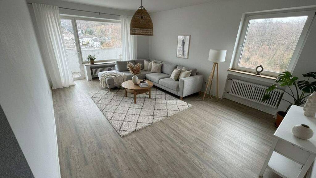 Diese 3-Zimmer-Wohnung befindet sich im 8. Obergeschoss eines gepflegten Gebäudes in Iserlohn, Bieler Straße. Die Wohnfläche beträgt 80,87 m² und bietet helle, großzügige Räume mit hochwertigem Laminatboden. Die Wohnung verfügt über einen langen Flur mit Einbauschrank, ein modernes Badezimmer mit Badewanne, eine Küche mit Fliesenboden und Tageslichtfenster sowie einen lichtdurchfluteten Wohnbereich mit Aussicht ins Grüne.