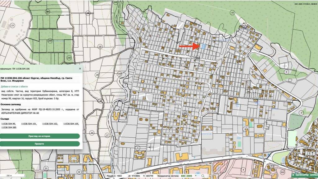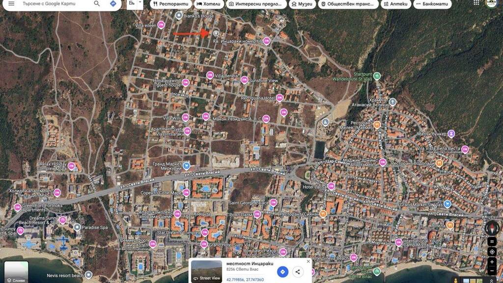 In Intsaraki, einer der begehrtesten und exklusivsten Gegenden von Sveti Vlas, steht ein hervorragendes Baugrundstück mit 467 m² zum Verkauf. Das Grundstück verfügt bereits über Wasser- und Stromanschluss, was den Bauprozess deutlich vereinfacht und Anschlusskosten spart. Intsaraki ist eine beliebte und gehobene Wohngegend von Sveti Vlas, eingebettet in einen Berghang. Fast jedes Grundstück bietet einen wunderschönen Panoramablick auf das Meer, Nessebar und Sonnenstrand.