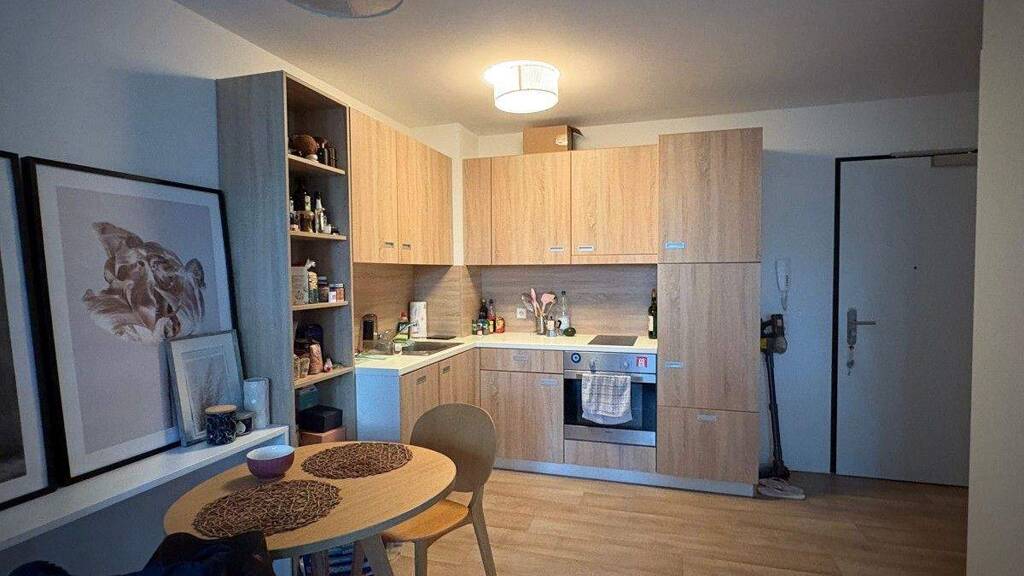 - 1 Schlafzimmer mit eingebauten Schrank - 1 Küche: diese verfügt über Kühlschrank, Backofen, Glaskeramikkochfeld, Spülmaschine, Dunstabzugshaube und Spüle - 1 Wohn - Arbeitszimmerbereich mit Sofa, Esstisch und Stühlen sowie ein Schreibtisch - 1 modernes Badezimmer mit Dusche - 1 Terrasse
