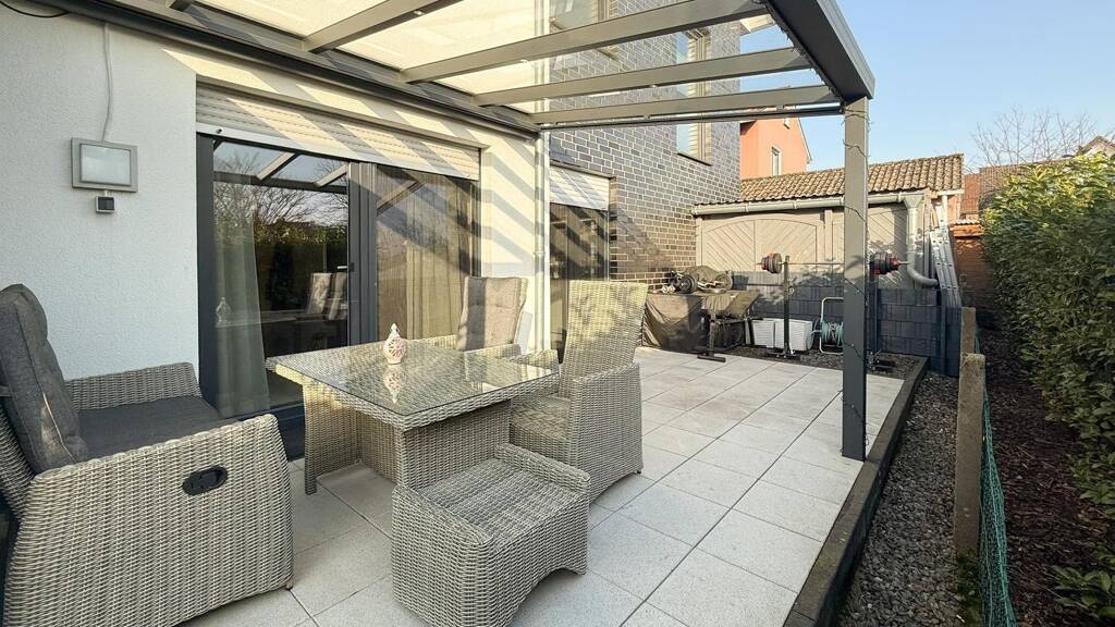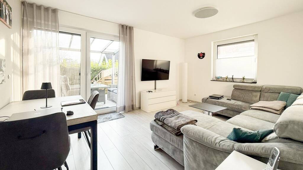 Der Mittelpunkt der Wohnung ist der großzügige Wohn- und Essbereich mit direktem Zugang zur überdachten Terrasse und in den eigenen Garten. Die hochwertig gestaltete Terrassenüberdachung mit integrierter Beleuchtung und Markise schafft einen geschützten Außenbereich, der nahezu ganzjährig genutzt werden kann und den Wohnraum angenehm erweitert.