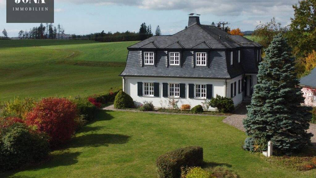 Die Außenansicht mit traditionellem Schieferdach und klar gegliederter Fassade vermittelt stilvolle Beständigkeit und fügt sich harmonisch in die ruhige Umgebung ein.Die weitläufige Terrasse und der gepflegte Garten bieten viel Platz für Erholung und Privatsphäre.