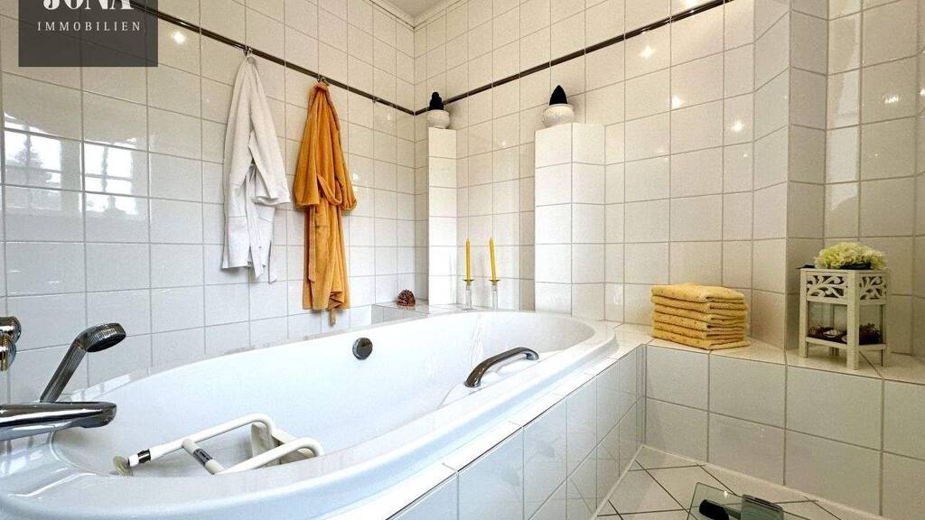 Bereits beim Betreten empfängt Sie eine großzügige Diele mit edlem Marmorboden, stilvollen Einbauten und einem offenen Übergang zu den Wohnräumen. Großformatige, bodentiefe Fenster durchfluten die Räume mit Licht und eröffnen den Blick auf die weitläufige Terrasse und den gepflegten Garten.