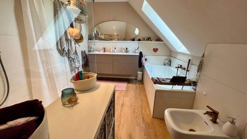 Das Haus verfügt über insgesamt zwei Bäder, die mit hochwertigen Armaturen und stilvollen Fliesen ausgestattet sind. Hier können Sie sich in luxuriöser Atmosphäre verwöhnen lassen und Ihre ganz persönliche Oase der Entspannung schaffen. Zusätzlich steht Ihnen ein Gäste-WC zur Verfügung, das sowohl funktional als auch stilvoll gestaltet ist.