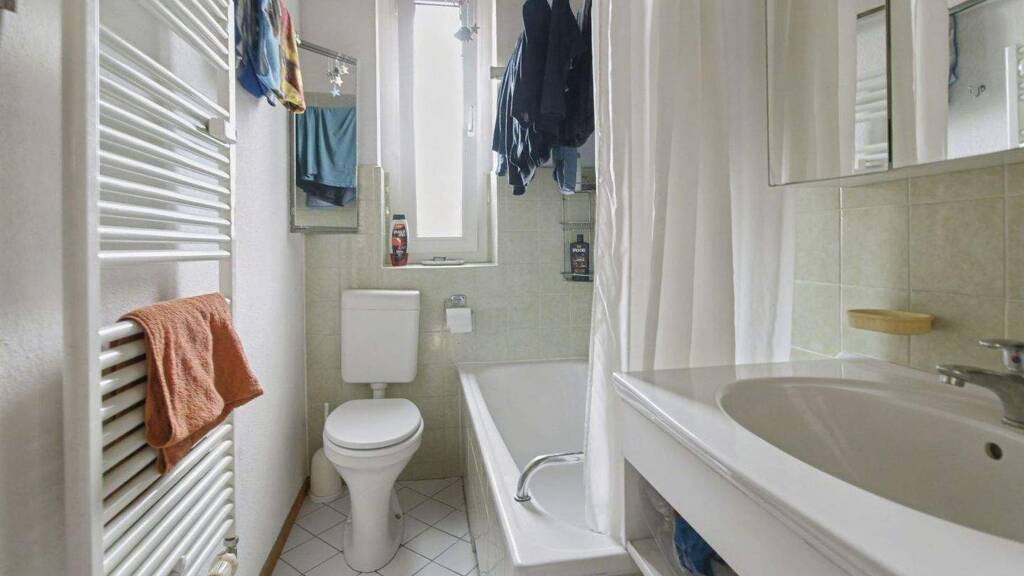 Das Tageslichtbad mit Badewanne überzeugt durch praktische Ausstattung. Weitere Nutzfläche bietet der zur Wohnung gehörende Kellerraum, ideal für zusätzlichen Stauraum.