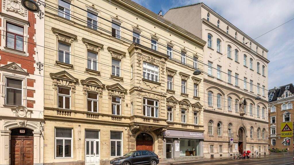 Die Liegenschaft befindet sich im 1. Stock (kein Lift) eines repräsentativen Altbaus mit gegliederter Fassade. Das Haus versprüht historischen Charme und befindet sich in einem guten Gesamtzustand.