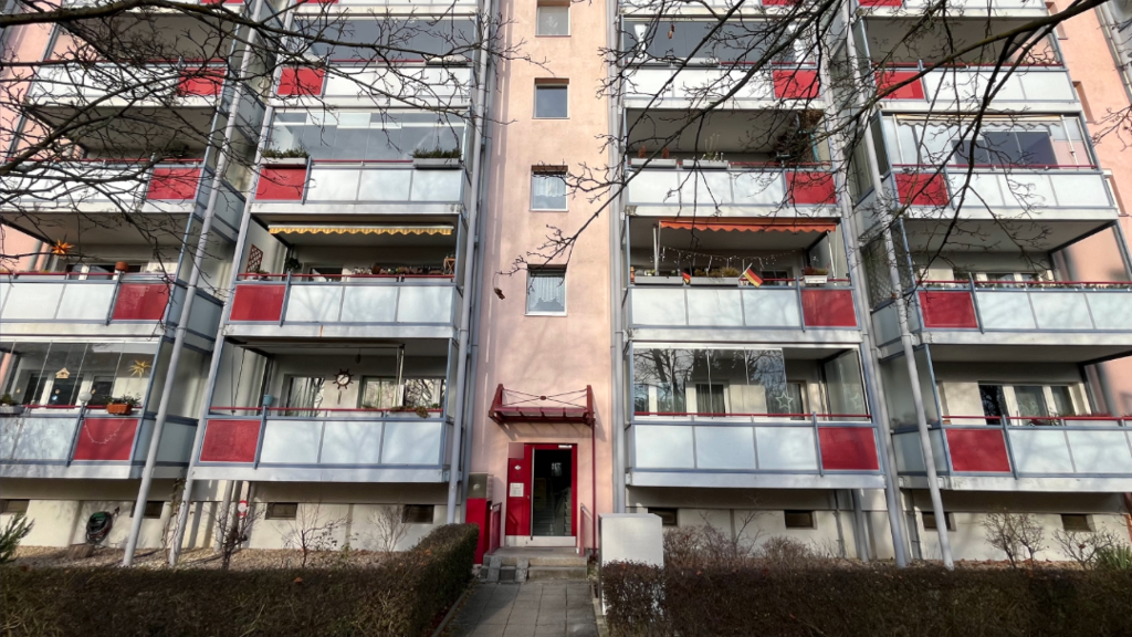 Das Gebäude verfügt über zwei Hauseingänge: einen straßenseitigen sowie einen zweiten Zugang über den ruhigen Innenhof mit Grünanlage, Spielplatz und Wäschetrockenplätzen. Der Hofbereich wurde 2025 neu eingezäunt und mit zwei verschließbaren Zugängen gesichert. Die Müllstandsflächen sind bequem von der Straße aus erreichbar.