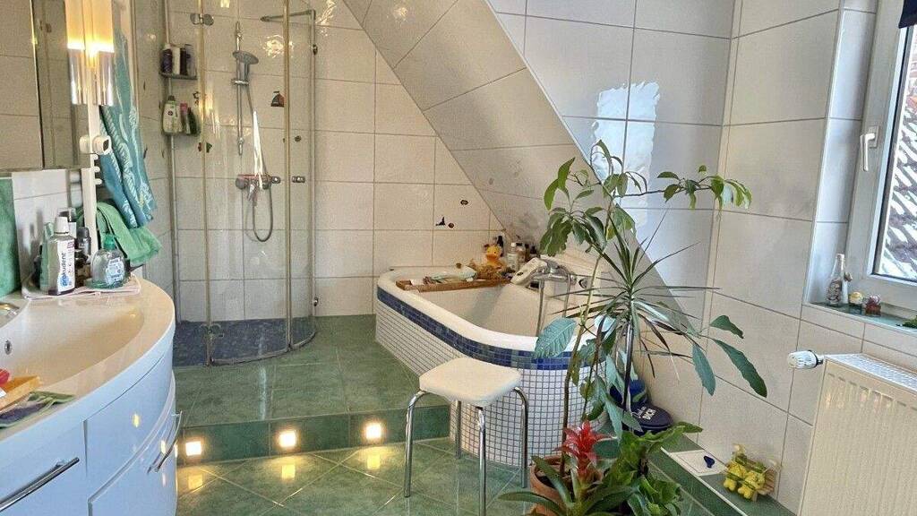 Über einen weiteren kleinen Flur gelangt man in das Dachgeschoss. Hier stehen ein Flur, eine Abstellkammer, zwei Zimmer sowie ein modernes Tageslichtbad mit Dusche, WC, Waschtisch und Badewanne zur Verfügung.