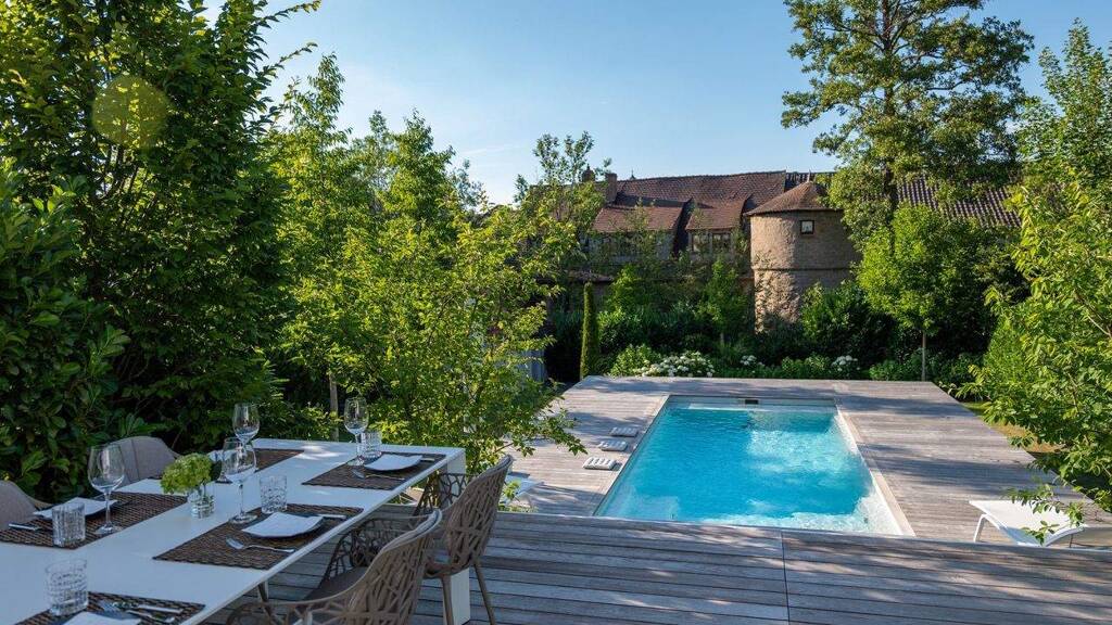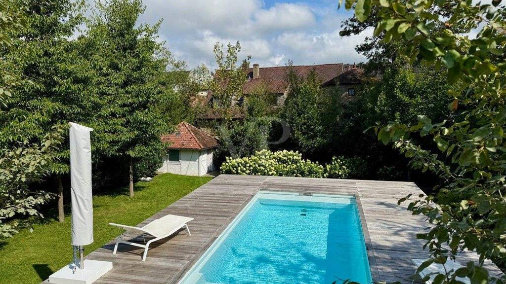 Die moderne Immobilie für höchste Wohnansprüche mit harmonisch gestaltetem Garten und beheizbarem Pool besticht durch eine klare und ansprechende Architektur und schickem Interieur.