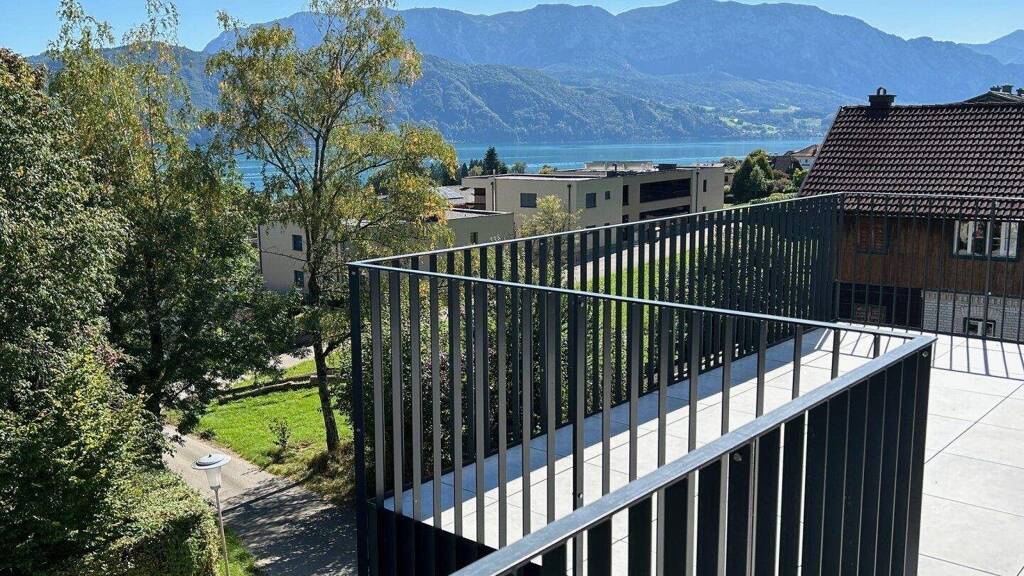 Die höher liegenden Wohnungen haben jeweils einen breiten, zum Attersee hin ausgerichteten Balkon.