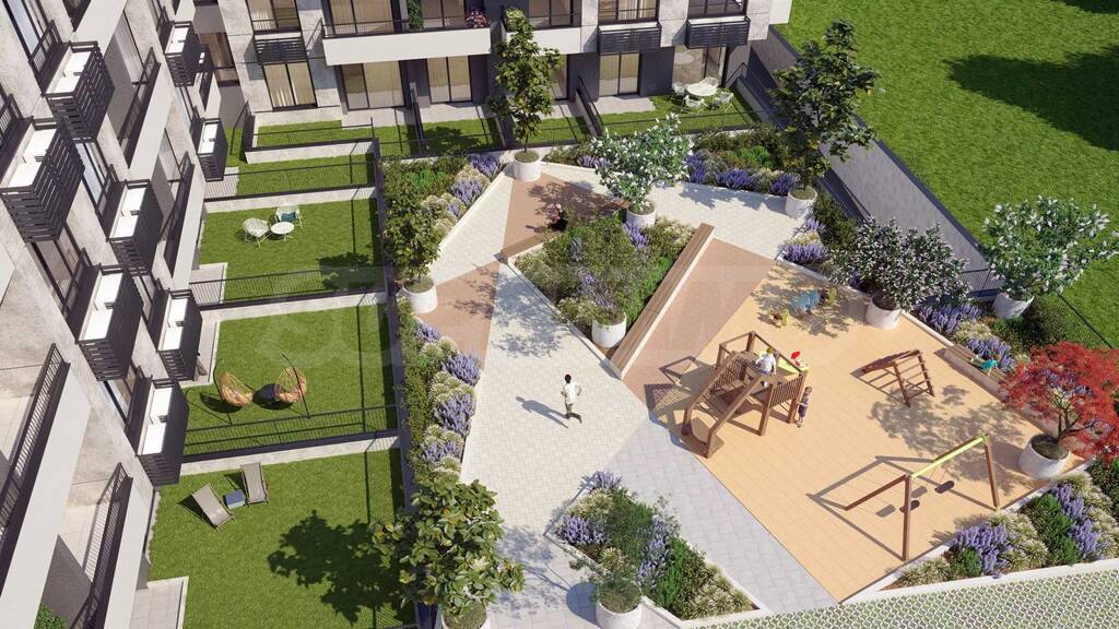 Das Gebäude verfügt über 5 Stockwerke mit moderner Architektur, klaren Linien und einer eleganten Fassade. Es bietet funktionale Studios sowie Apartments mit einem oder zwei Schlafzimmern. Der Komplex verfügt über ein wunderschön angelegtes Gelände und einen Kinderspielplatz. Für Parkplätze stehen Tiefgaragen, oberirdische Parkplätze und Garagen zur Verfügung.