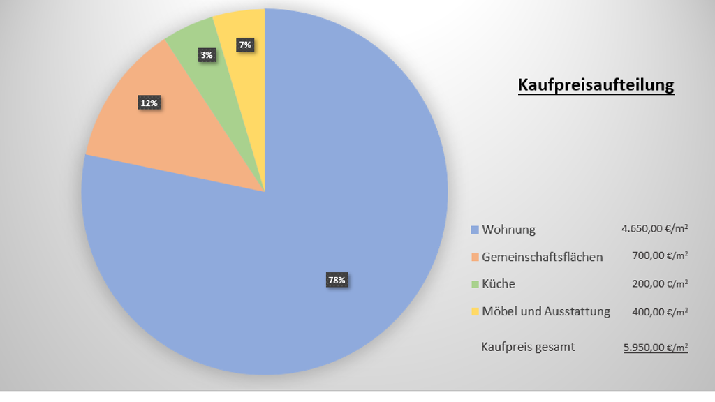 Der Anteil für dieses zusätzlichen Gemeinschaftsflächen beträgt zusätzlich 700,00 €/m² und die dazugehörige Ausstattung und Möblierung 400,00 €/m² sowie eine Küche im Wert von ca. 18.000,00 €.