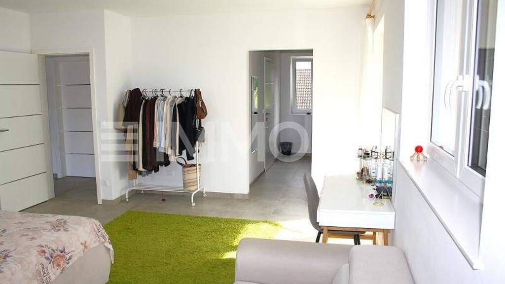 EG: 1 geräumige Diele samt vom Tischler maßgefertigter, integrierter Garderobe; 1 Gäste WC mit Handwaschbecken; 1 elegante, räumlich getrennte Küche samt Markengeräten, großem Essbereich und Gartenzugang; 1 geräumiges Wohnzimmer mit direktem Gartenzugang; 1 geräumige Speisekammer; 1 Technikraum und als Highlight 1 Gästezimmer mit WC samt Handwaschbecken und eigenem Eingang und somit ideal als Praxis, Studio, Therapieraum oder auch Büro. OG: 1 beeindruckendes Eltern-Schlafzimmer von knapp 30 m2 mit Zugang auf den Balkon sowie zum begehbarem Kleiderschrank und ins eigene Badezimmer mit Dusche und WC; 2 Kinderzimmer; 1 zusätzliches Badezimmer mit Dusche und WC; 1 großer Wirtschaftsraum mit Waschmaschine und Trockner. Der gepflegte und kleine Garten bietet ausreichend Platz für Ihre Grillparty, Familienfeier sowie auch zur Erholung und beschert Ihnen aufgrund der Größe keine mühsame Pflege nach Ihrem anstrengendem Arbeitstag und birgt daher für ein gelungenes Miteinander für die ganze Familie. Weitere Hardfacts dieser einmaligen Haushälfte wären u.a.: elektr. Rollläden und Raffstores; Fußbodenheizung mit Kühlfunktion ( Luftwärmepumpe); 3 fach verglaste Fenster und Terrassentüren; Glasfaser für schnelles Internet und TV ( 300 Mbit erweiterbar); Vorinstallation für PV vorbereitet; 1 Garage;
