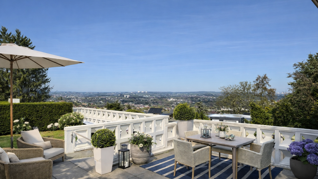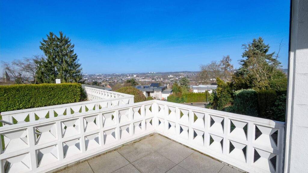 Durch die leicht erhöhte Lage eröffnet sich sowohl aus dem Wohnzimmer als auch aus dem Garten ein weiter Panoramablick über die umliegende Nachbarschaft und in die Talachse Wuppertals. Diese Aussicht verleiht dem Haus eine besondere Atmosphäre und sorgt für ein Gefühl von Weite und Offenheit.