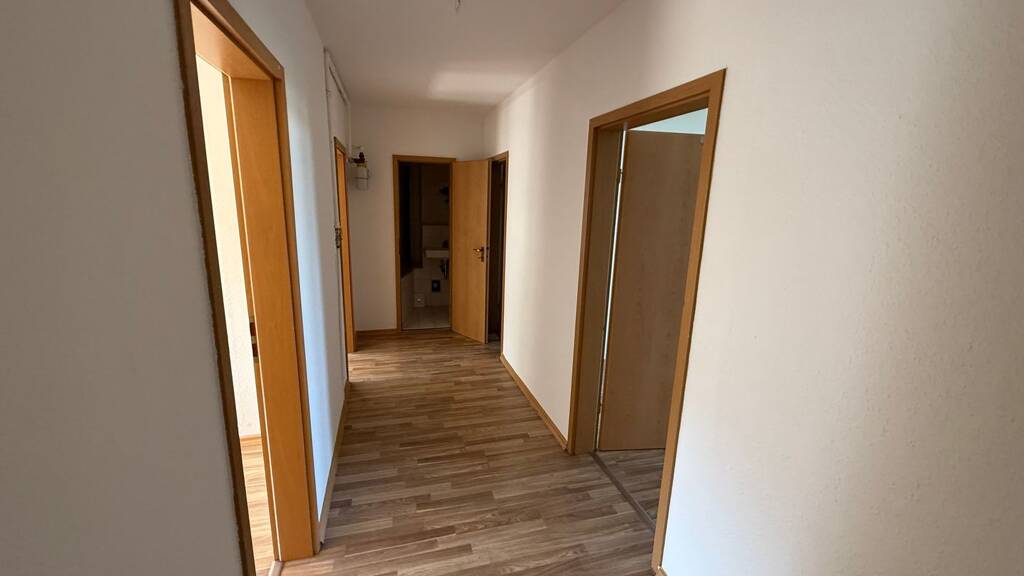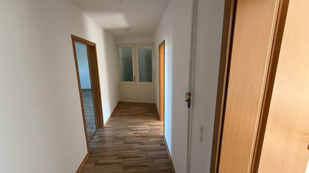 Die Wohnung ist aufgeteilt in ein Wohn- und 2 Schlafzimmer, eine große Essküche, einem Flur sowie einem kleinen Bad mit Wanne. Die großzügig geschnittene Essküche bietet viel Platz für Familien . Zur Wohnung gehören ebenfalls 2 Abstellräume und ein Keller.