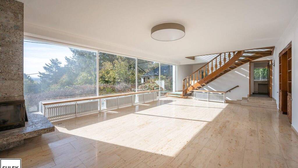 Im Obergeschoss befindet sich der zweite große und ebenso lichtdurchflutete Wohnbereich, welcher vor allem durch die offene Glasfront mit Blick ins Grüne besticht. Auch im Obergeschoss ist ein offener Kamin vorhanden. Zudem gelangen Sie direkt zum angrenzenden Südostbalkon, welcher einen phänomenalen Ausblick bietet. Weiters im Obergeschoss befinden sich zwei Bäder, ein separates WC, sowie vier weitere Wohnräume / Schlafzimmer, wovon eines über einen praktischen Schrankraum verfügt.