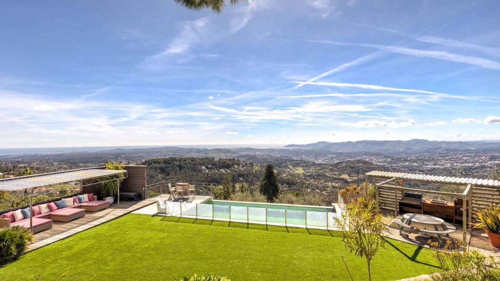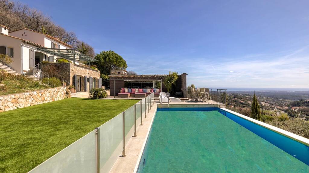 Set on exceptional grounds of more than one hectare with olive trees, stone walls and Mediterranean essences, a stunning infinity pool where you can admire the panoramic view to the sea, several terraces, sitting places and patios, ideal for receptions and to entertain friends and family, complete this unique property in Riviera Countryside.