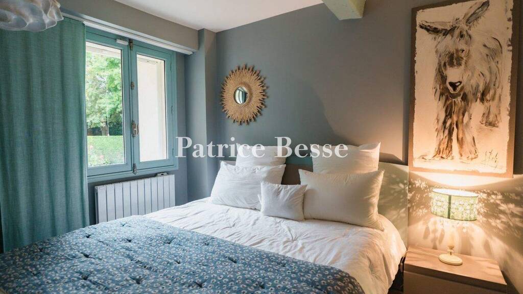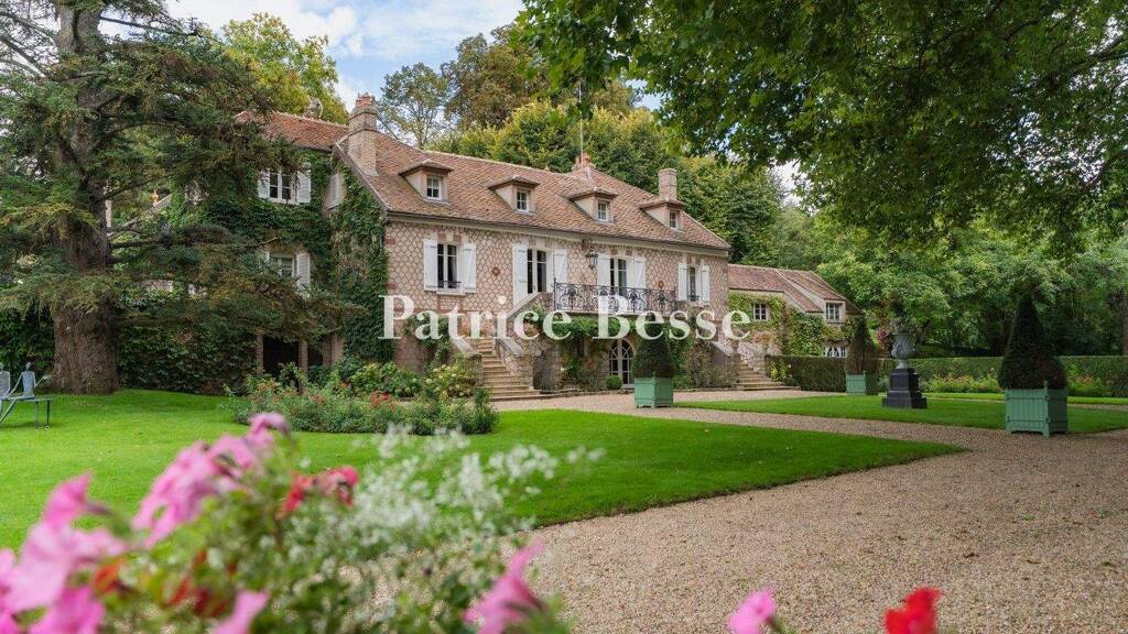 The ground floor has a spacious entrance hall, which is also a living room. On its right side, it leads to a large lounge and then to an office. On its left side, it leads to a small lounge with a dining area and to the kitchen, as well as a little room known as the "Volière" (literally the "Aviary"). White stone tiles patterned with black square inserts cover the floor of the entrance hall and living room. Solid oak herringbone parquet extends across the other rooms, except in the kitchen and adjoining entrance hall, which have floors of hexagonal terracotta tiles. Two large 18th-century fireplaces - one made of white marble in the large lounge, the other made of white stone in the kitchen - heat up the rooms. Mouldings, wooden panelling, painted doors, wallpaper with foliage motifs and harmonious wall colours create a welcoming atmosphere throughout the home, yet one that keeps the personalised identities of each room. The kitchen, a triple-aspect space, offers a 30m² floor ...
